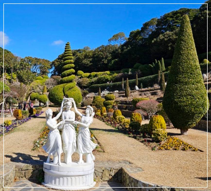 식물뿐만 아니라 조각공원과 유럽풍 정원도 외도 보타니아의 매력을 더해주는 요소입니다. 다양한 조각 작품들이 곳곳에 설치되어 있어 예술적인 감성을 자극하며, 유럽풍 정원에서는 아기자기한 건물과 정교하게 다듬어진 잔디밭이 어우러져 마치 동화 속 한 장면을 연출하는 듯했습니다.